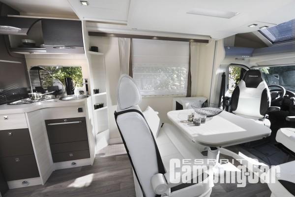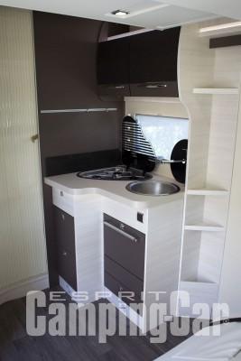 L’arrière se montre également original. Le bloc-cuisine conserve une identité classique avec une place trois feux, une petite crédence et quelques rangements très utiles. On regrette que le plan de travail ne soit pas plus grand. Cela ne colle pas avec l’idée d’accueillir du monde dans le grand salon. Par contre, en face du bloc-cuisine, Chausson équipe son profilé d’un grand réfrigérateur 175l avec la technologie AES.