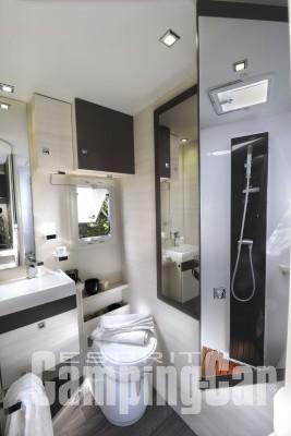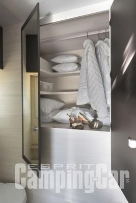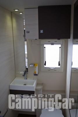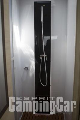 L’espace salle d’eau arrière est des plus spacieux. Il rappelle bien entendu celui déjà vu sur le 628. Pour y accéder, méfiez-vous de la petite marche d’accès. Vaste, aéré, cet espace dispose d’une douche séparée du reste de l’ensemble. L’apport des caillebotis est important pour votre confort de toilette. Si la hauteur sous plafond est convenable, les personnes à forte corpulence pourraient éprouver quelques petits soucis sur la largeur de l’espace douche. Malgré ce détail, cette salle d’eau est idéale pour un couple. Elle devance un grand dressing accessible en ouvrant les deux portes-miroirs. Ce dressing apporte une solution de rangement de plus simple d’utilisation et très utile.