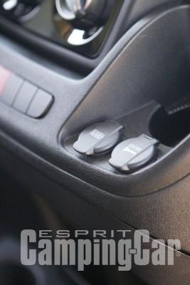 L’innovation du constructeur se trouve dans ce lit de pavillon qui, contrairement aux classiques que tout le monde connait, se trouve désormais en position longitudinale, de type, lit central. Ce couchage deux personnes est à commande électrique et se propose dans des dimensions idéales pour bien dormir (200×140). Pour vous donner le choix de transformer le salon en couchage d’appoint ou non, Chausson vous donne le choix de deux hauteurs de pose (2m ou 1m40) pour le lit de pavillon. Un bon point, même si le couchage d’appoint du lit de dinette n’est guère enthousiasmant niveau confort nocturne. Par cet agencement, ce profilé se définit clairement pour un couple aimant recevoir des amis autour d’une bonne table. On apprécie, par ailleurs, la présence d’une prise USB au-dessus du poste conducteur. Un atout à nos yeux vu que plus de 90% des camping-caristes sont désormais équipés de smartphones ou tablettes. Les sièges avant pivotants se manient très facilement (un plus comparé à ceux du Ford Transit).