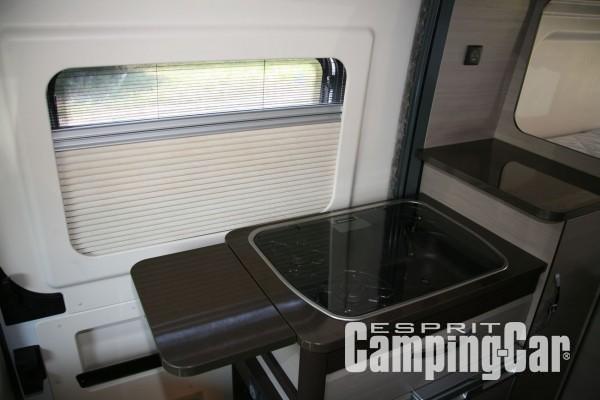 - Le petit bloc cuisine gagne en fonctionnalité grâce à la présence d’un plan de travail rabattable.