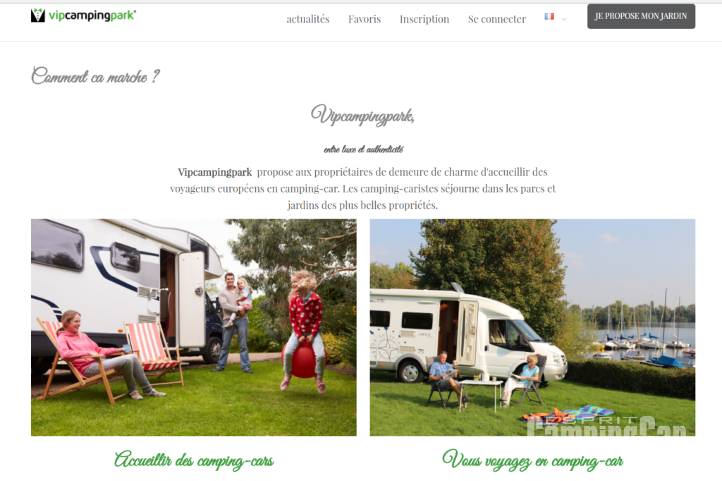 L’idée est simple : Vipcampingpark propose aux propriétaires de demeure de charme d’accueillir des voyageurs européens en camping-car. Les camping-caristes séjournent dans les parcs et jardins des plus belles propriétés.
