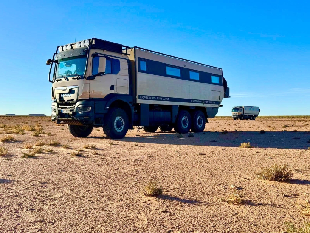 Le Global XRS 7400 Leopard 2.0 est posé sur le châssis très rare sur le marché du MAN 33.510 6,6l d’une puissance dingue de 510 chevaux. Son empattement mesure 4.200 millimètres. Grâce à sa transmission intégrale permanente, à la suspension spéciale à ressorts hélicoïdaux signée Action Mobil, à un système de régulation de pression des pneus hautement perfectionné ainsi qu’à de nombreux dispositifs de protection du réservoir, du châssis et des composants, ce monstre est conçu pour affronter les conditions tout-terrain les plus extrêmes. Il franchit sans effort des dunes abruptes, des pistes de gravier interminables, des gués ou encore des routes de montagne.