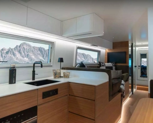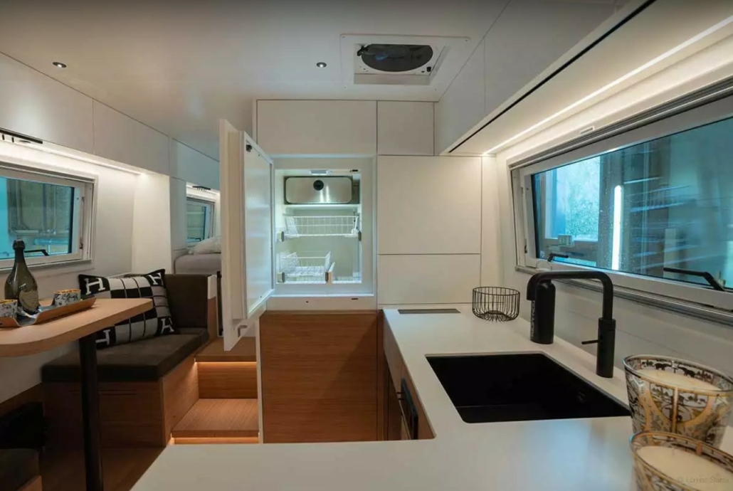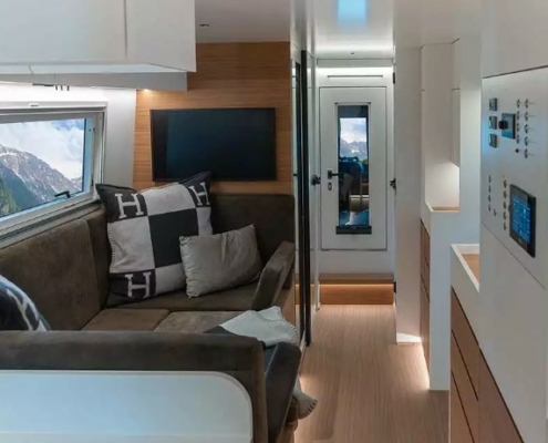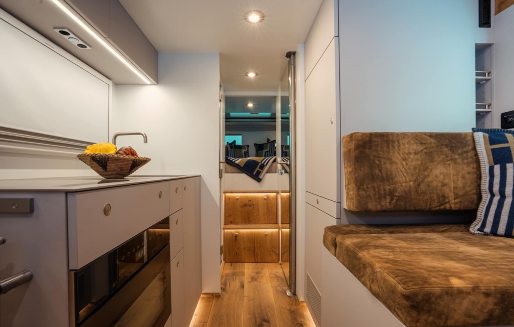 L’espace de vie séduit par un large coin salon en U, transformable au besoin en lit confortable. Des revêtements haut de gamme, au choix en Alcantara ou même en cuir de cerf, soulignent le caractère luxueux. Des tiroirs et placards muraux bien pensés offrent de nombreux rangements. Dans la chambre séparée, des matelas de qualité supérieure et des sommiers à lattes assurent un sommeil réparateur. Une grande fenêtre de toit apporte beaucoup de lumière naturelle et ouvre la vue sur le ciel.