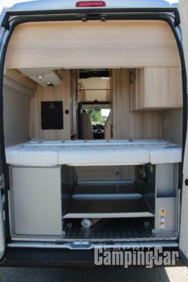 Long van de 6m36, cette solution accueille quatre vrais couchages avec le traditionnel lit transversal sur soute (137×192) ainsi qu’un lit de pavillon assisté par vérin en position longitudinale.