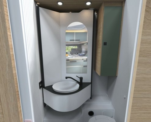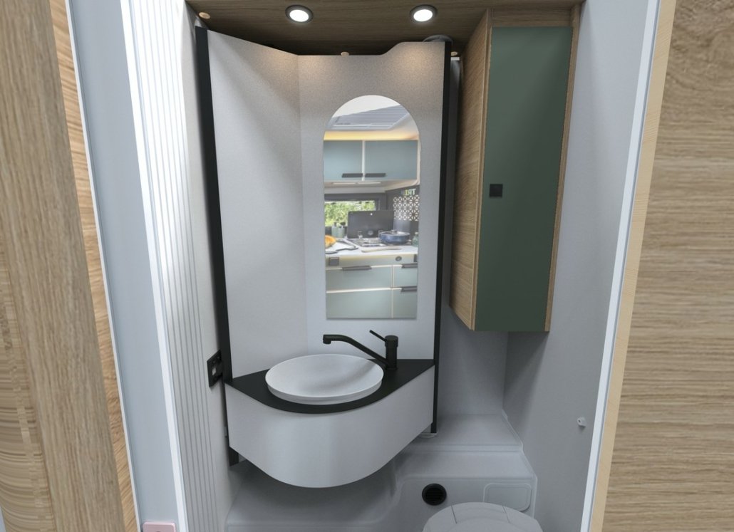 Les profilés X restent au nombre de deux (X150/X250). Pour 2026, ils subissent quelques retouches. Notamment au niveau de la salle d’eau avec une nouvelle de bain Vario équipée d’une nouvelle paroi pivotante permettant un vrai gain de place à l’usage. Son design est épuré et contemporain. Challenger utilise des nouveaux matériaux qui rendent l’entretien de la salle d’eau plus simple et limitent la projection d’eau.