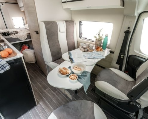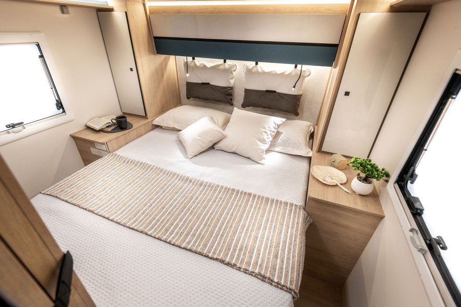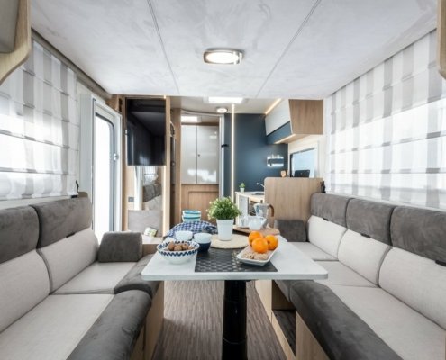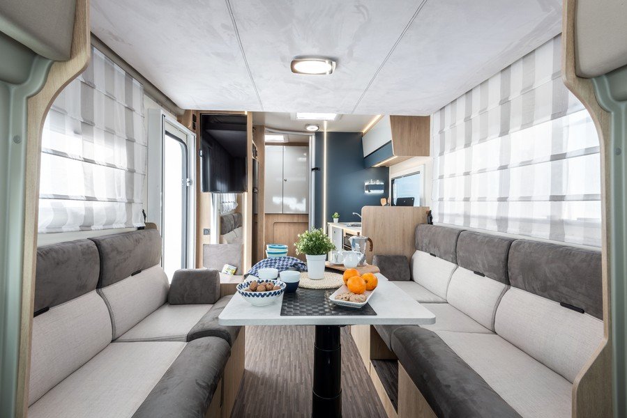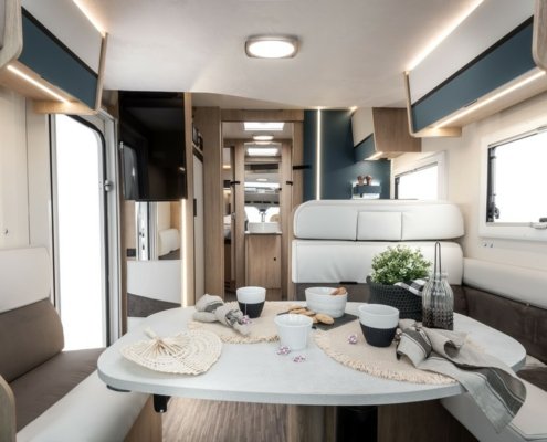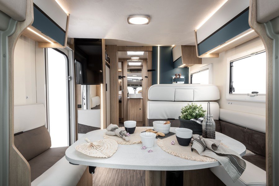 Par ailleurs, le constructeur a supprimé le coffre de rangement sous la table du salon, améliorant ainsi le confort des assises. Ces dernières disposent d’une nouvelle sellerie plus agréable et douillette. C.I. a revu le design des meubles de pavillon avec des poignées cachées mais aussi des éclairages LED intégrés dans le profil bas et équipés d’un interrupteur tactile. Enfin, grâce à une nouvelle conception de la zone arrière, le constructeur parvient à élargir le couchages des modèles 2 et K2.