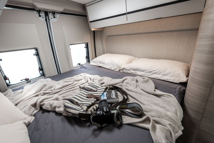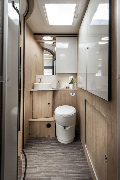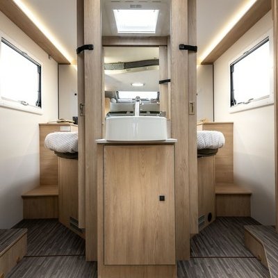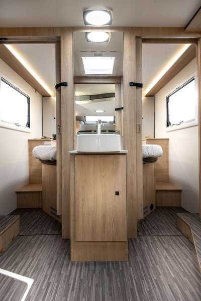 La famille des Horon accueille également deux nouvelles implantations dans son offre. Le 66L XT, long de 7,45 mètres, se présente avec 5 places carte grise et 5 places couchage. Il se distingue au niveau de sa partie arrière en accueillant un grand lit central installé derrière une salle de bain traversante. Cette salle d’eau est très convaincante car des plus fonctionnelles.