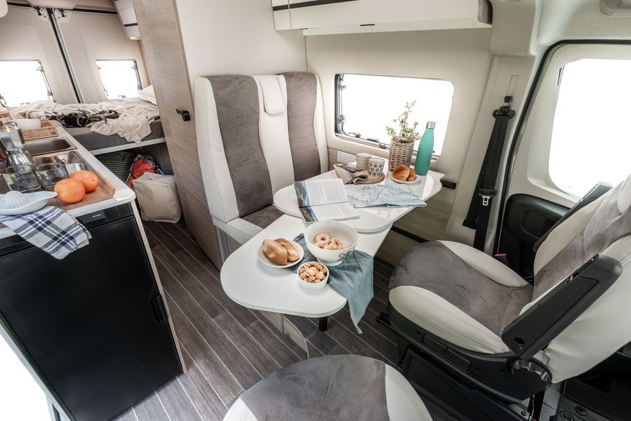 Les Kyros Go ont subi un profond lifting bienvenu. Ils sont désormais posés sur le Citroën Jumper 140 chevaux. Extérieur, leur look chose avec un nouveau design plus sobre, plus discret mais qui passe très bien car pas tape-à-l’œil. A l’intérieur, là aussi, changement de décors, avec un habitacle plus lumineux et plus raffiné que par le passé. Les teintes claires du mobilier apportent un vent de fraîcheur et de clarté à l’ensemble. C’est très agréable.