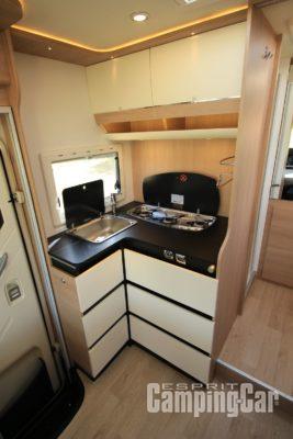 Le bloc cuisine en L inversé se montre fonctionnel. A l’arrière, Itineo installe une grande salle d’eau avec une douche séparée ainsi qu’un immense dressing de type penderie. Cet intégral est très bien pensé et fonctionnel tout en disposant de nombreux rangements.
