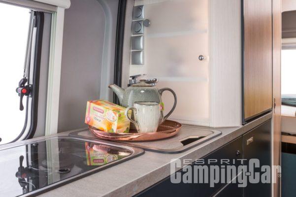 C’est tout d’abord dans une ambiance claire et lumineuse que vous entrez et vive. Le salon peut recevoir quatre convives à table. Si vous décidez d’investir un peu plus, vous disposerez en outre d’un lit de pavillon pouvant coucher deux personnes. La kitchenette offre un design moderne. Le traitement du mobilier à base de CPL anti-rayure est de qualité. Les rangements sont nombreux et fonctionnels. Ils sont de plus accessibles de l’intérieur, bien entendu, mais aussi, plus surprenant, de l’extérieur. Astucieux.