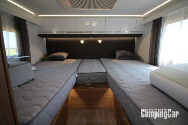 A l’arrière, place à des lits jumeaux posés sur soute, l’une des fortes tendances de 2019 également. Posé sur Fiat Ducato, ce grand profilé est présenté sur la finition PLUS, l’intermédiaire pour Adria. Niveau équipement, vous retrouverez donc les suspensions pneumatiques, le radar de recul, l’excellent chauffage Truma 6000, le grand lanterneau, les rétroviseurs de type bus, la gazinière avec four, la hotte aspirante, les jantes alu 16’’ ou encore les vérins de parking.