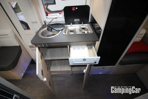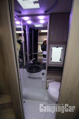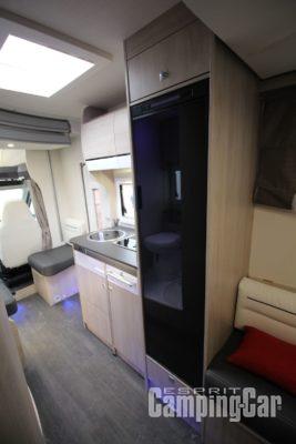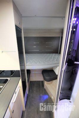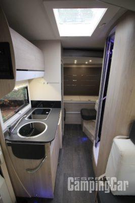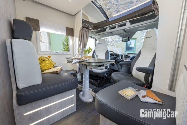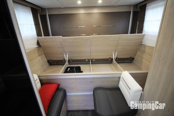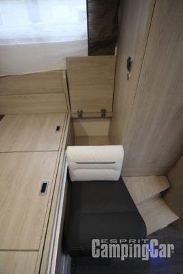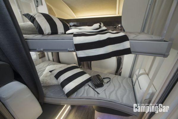 Pour le suspense, Challenger reste droit dans ses bottes et innove avec un profilé ultra-compact (6m39, mais 2m92 de haut) à vocation familiale. Dans cet espace réduit, le constructeur parvient à poser 4 couchages, deux à l’avant avec le système « Duo Bed » (lit superposés de pavillon, à commande électrique), deux à l’arrière avec un lit de pavillon deux places installé au-dessus d’une dinette transformable en couchage d’appoint pour un enfant. Dans sa conception, ce Quartz 274 dévoile donc deux espaces bien distincts.