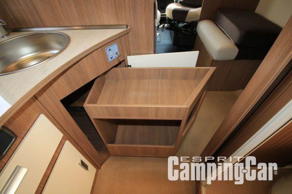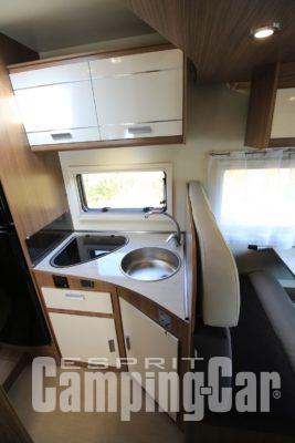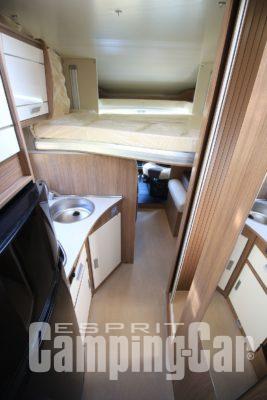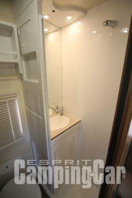 La kitchenette s’équipe d’un réfrigérateur 150l. En face, le constructeur présente une salle d’eau originale. Si elle se présente sous un côté deux-en-un, la douche est toutefois complètement indépendante.